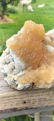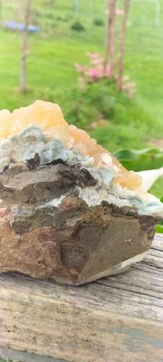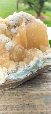 2kg Honey Calcite natural specimen on teal botryoidal Chalcedony